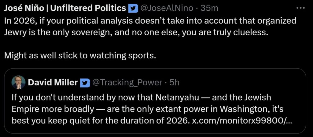 2026 is the year we stand up against the jewish oligarchy and against jewish supremacy. This is not what our ancestors wanted and not what any of us would choose. It is being forced upon us at gunpoint, as they incessantly plot to take away our rights and dispossess us further and further.