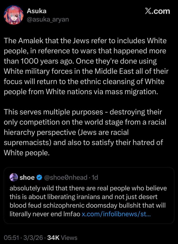 The treasonous government of the USA has started a war for jews. It has committed grave acts of atrocity and war crimes… for jews. There should be immediate investigations and impeachment hearings.