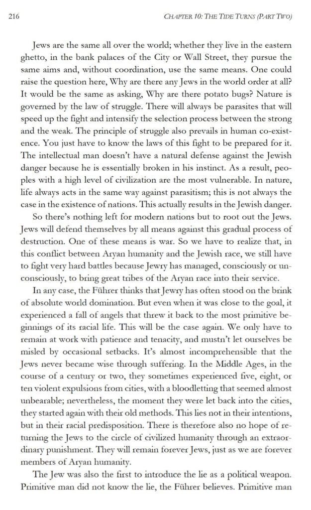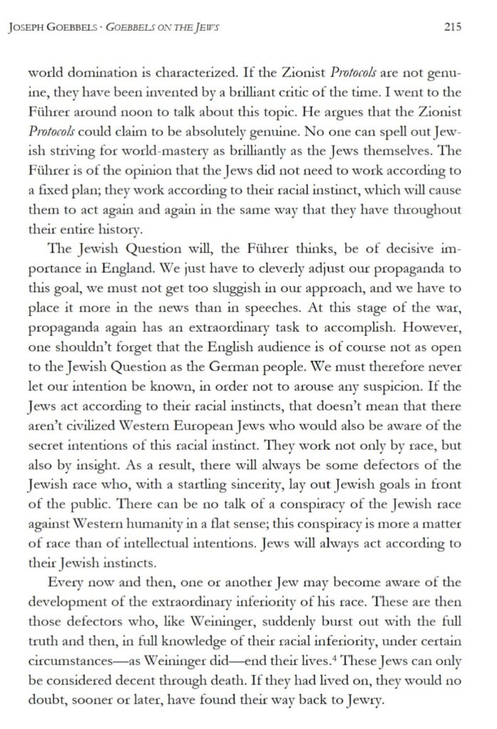 Goebbels is describing basic biology. Different evolutionary paths involve different strategies. Some strategies may be inferior but appear to be advantageous due to one with clouded insight. Germans correctly identified jews as alien organisms following a different, undesirable evolutionary strategy and didn’t want them in their society, which is perfectly within their rights as a people. It’s 100% healthy, good, and normal.